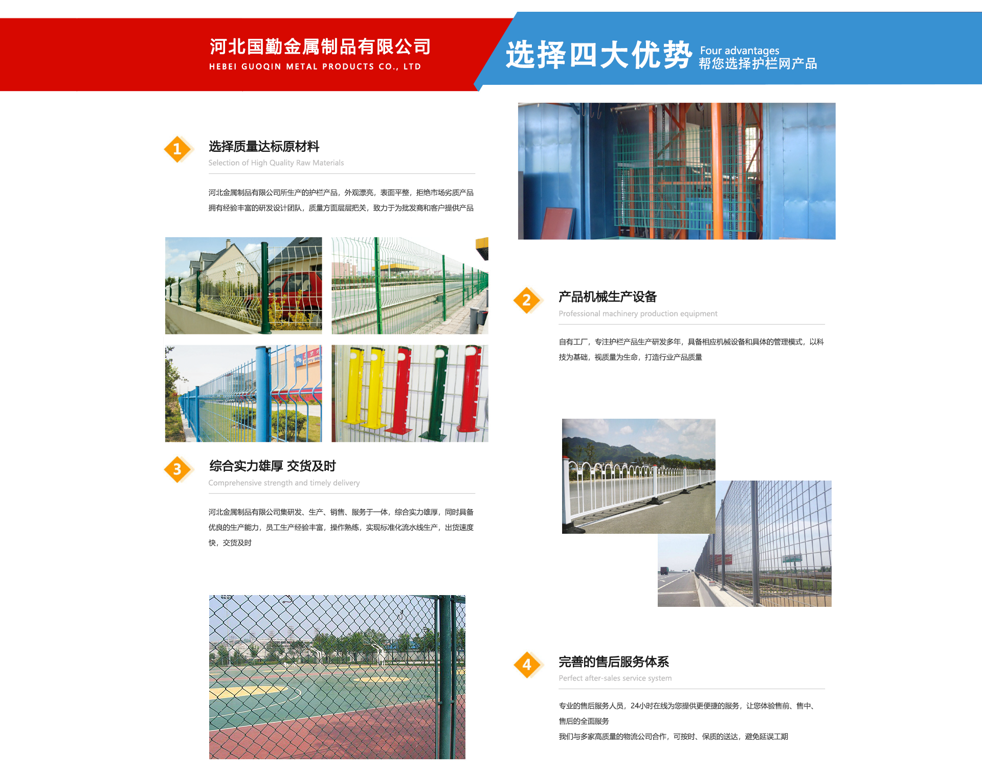 河北國勤金屬制品有限公司位于亞洲較大的絲網(wǎng)生產(chǎn)基地--享譽(yù)世界的“中國絲網(wǎng)之鄉(xiāng)”美譽(yù)的河北省安平縣境內(nèi)。主要是以研發(fā)設(shè)計(jì)、制造生產(chǎn)、銷售服務(wù)于一體的高科技現(xiàn)代化企業(yè)。河北國勤金屬制品有限公司主營產(chǎn)品有護(hù)欄網(wǎng),隔離網(wǎng),市政工程,草坪護(hù)欄等各種系列產(chǎn)品的制造廠家。我廠產(chǎn)品被廣泛應(yīng)用于公路、石化、化工、港口、合金、電力、造紙、鋼鐵、建材、市政、石油、污水處理及一般工業(yè)廠房、市政建設(shè)等各個領(lǐng)域。公司自成立以來一直為客戶提供優(yōu)良,貼心的服務(wù)。從售前售中售后我們都以客戶為導(dǎo)向,以設(shè)計(jì)先進(jìn)、高科技手段、價格低質(zhì)量優(yōu)等多方面為客戶提供整體全面的服務(wù)。我們相信科技創(chuàng)新的力量,本廠在產(chǎn)品技術(shù)基礎(chǔ)上不斷探索與創(chuàng)新,力求以更高品質(zhì)的產(chǎn)品、更合理的價格、更完善的售后服務(wù)、不斷豐富的產(chǎn)品線滿足于每一位客戶的需求。